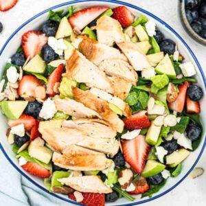 This Chick-fil-A Market Salad recipe is an easy copycat salad packed with chicken, fresh berries, and tangy apple cider vinaigrette. It’s a great dinner salad, lunch salad, meal prep…and will save you a ton of money vesus going to Chick-fil-A!